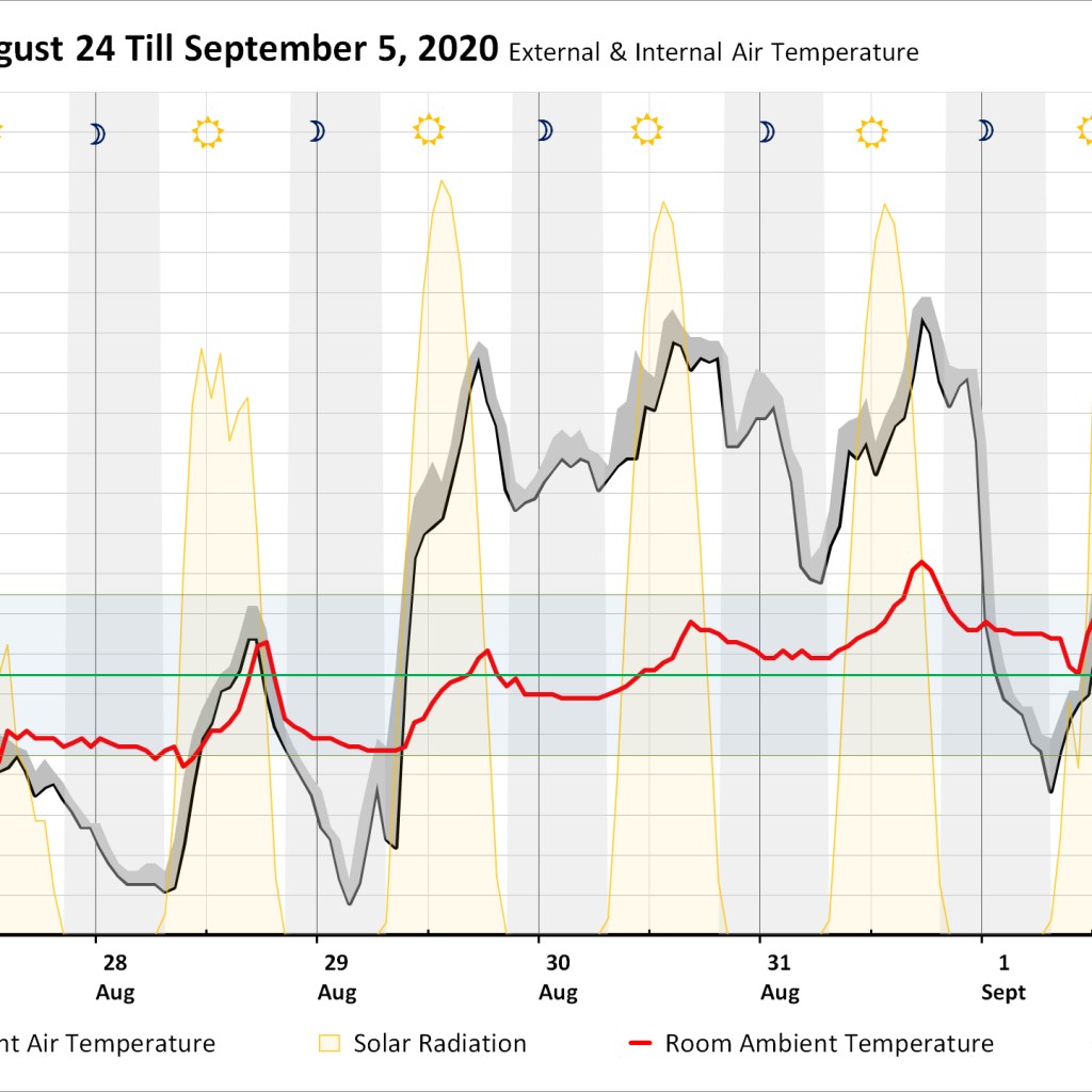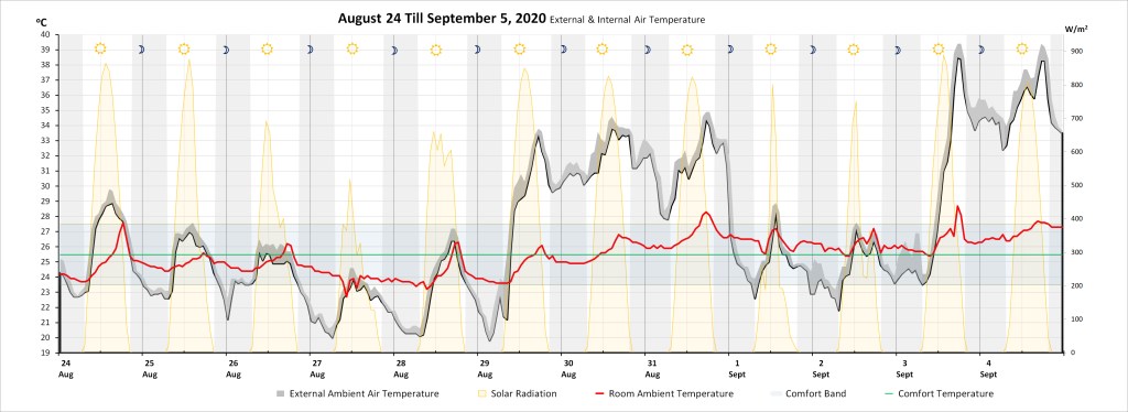 The graph spanning August 24 till September 4, show both internal and external temperature fluctuation of what can be described as a typical local residential building in terms of construction with no particular attention to any sustainable feature. The room monitored is facing west and is used more than a few hours daily by one person as a work/laptop station. The approximate floor and window areas are 12sqm and 3sqm respectively, for an internal height of 3m. The room is within an intermediate apartment (between a lower and upper floor). Windows are opened at random times, yet during the heatwave they were kept closed, unless for not more than 30min a day to get some (warm) fresh air. There is no mechanical cooling within the room, nor within the apartment. Fans are used during high peak temperature periods.