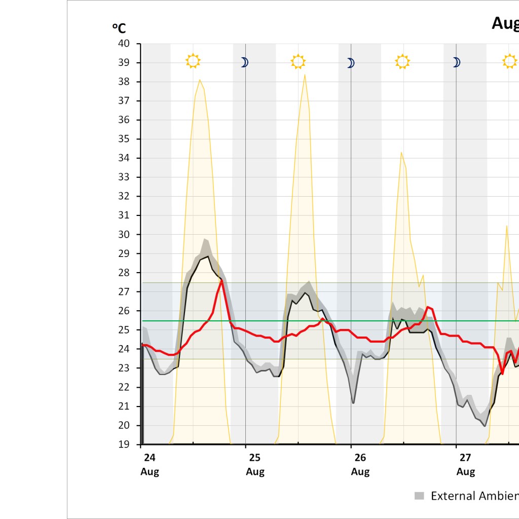 The first few days (Aug 24-26) external temperature is moderate with a clear drop between day and night temperature. Typically, inertial temperature during the larger part of the day (morning and noon) are lower than the external ones, and this even if when the windows are open. Internal temperature starts to rise when the afternoon sun hits the room. When this happens dark brown aluminum shutter are closed during later afternoon till the early evening when the window is open for a short time, before being closed again for the night.